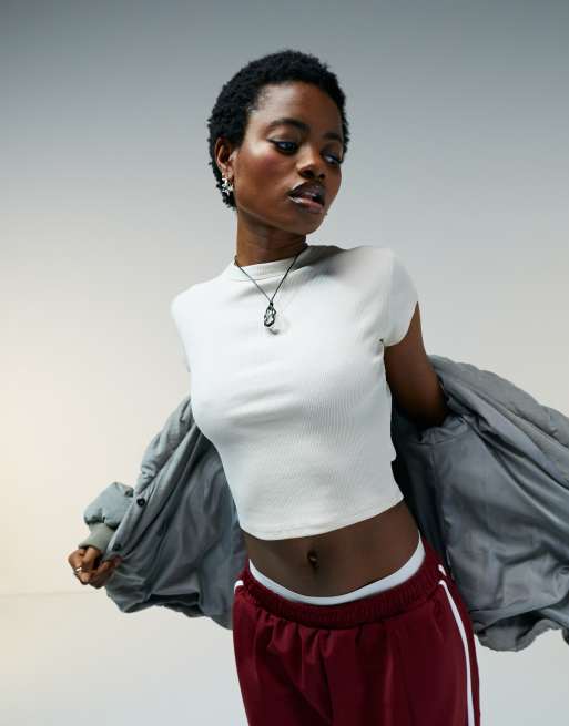 Camiseta color piedra con diseño encogido y manga de casquillo de canalé de ASOS DESIGN