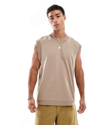 Camiseta color piedra extragrande sin mangas con cuello de pico y costuras en contraste de ASOS DESIGN