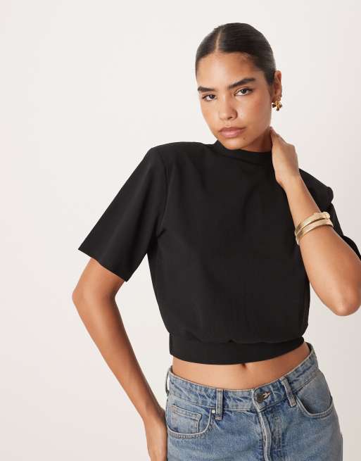 Camiseta corta negra con hombreras y cuello subido de ASOS DESIGN