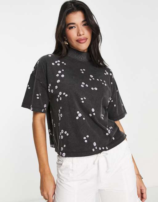 Camiseta de corte cuadrado con cuello alto, lavado gris carbón y margaritas bordadas de ASOS DESIGN