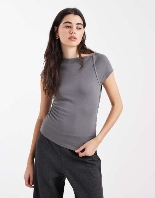 Camiseta gris carbón con mangas de casquillo y detalle fruncido de canalé de ASOS DESIGN