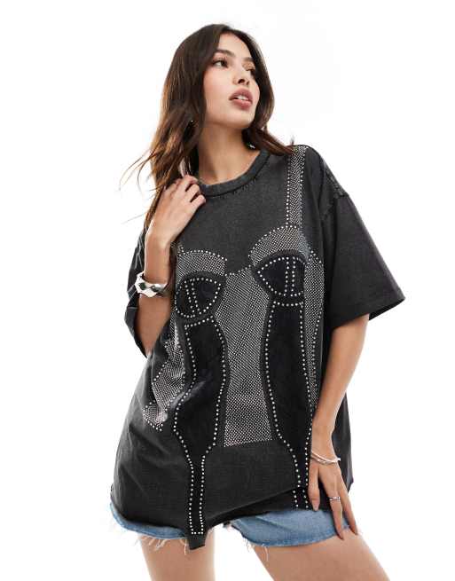 Camiseta gris carbón lavado extragrande con diseño gráfico y aplicaciones estilo corsé de ASOS DESIGN