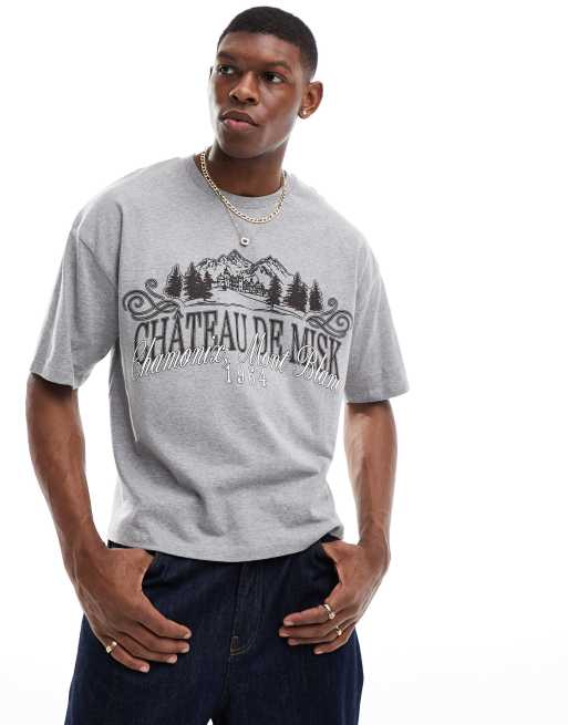 Camiseta gris jaspeado de corte cuadrado extragrande con estampado gráfico de paisaje en el pecho de ASOS DESIGN