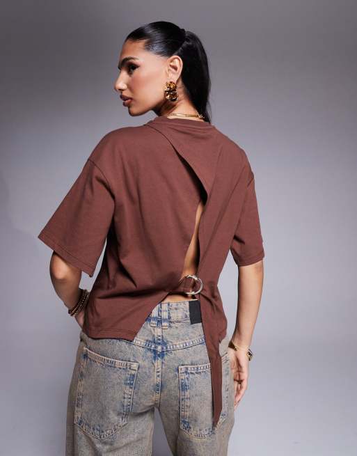 Camiseta marrón chocolate de corte cuadrado extragrande con detalle regulable en la espalda con anilla en forma de "D" de ASOS DESIGN