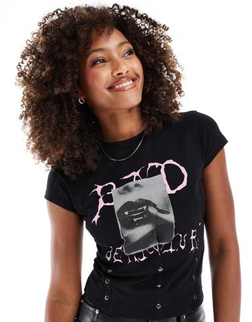 Camiseta negra con cintura estilo corsé, estampado rosa y tachuelas de ASOS DESIGN