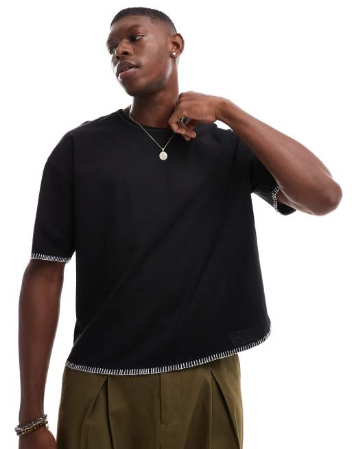 Camiseta negra de corte cuadrado extragrande con detalles de punto festón de ASOS DESIGN