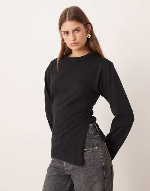 Camiseta negra de manga larga con cintura entallada y abertura lateral en el bajo de ASOS DESIGN