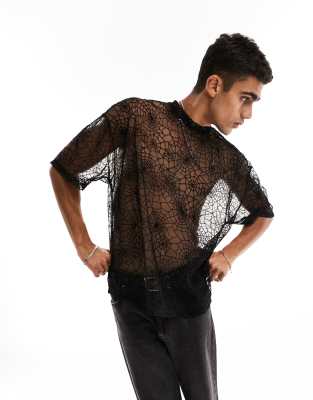 Camiseta negra extragrande con diseño flocado de telaraña de malla de ASOS DESIGN