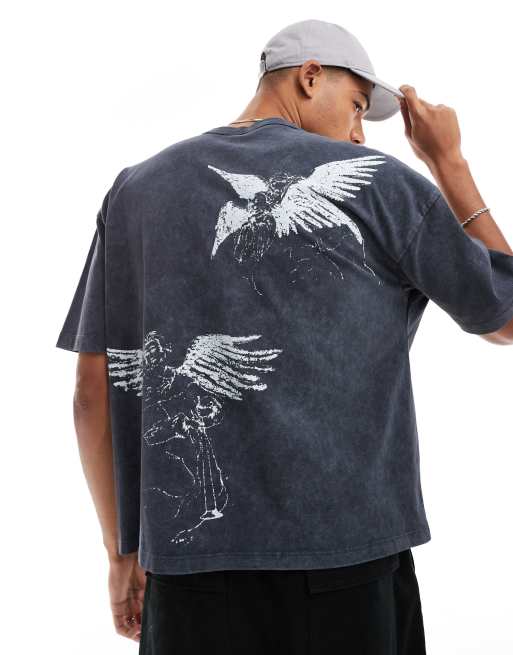 Camiseta negro lavado de corte cuadrado extragrande con estampado posicional de ángel de tejido grueso de ASOS DESIGN