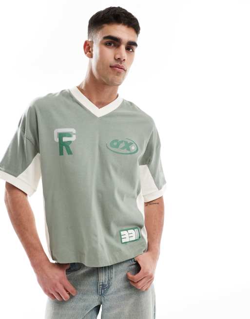 Camiseta verde de corte cuadrado extragrande con hombros caídos, detalle de paneles cosidos y estampados gráficos deportivos de ASOS DESIGN
