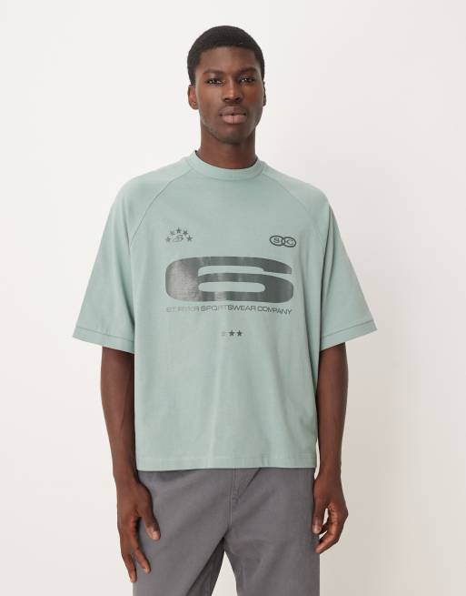Camiseta verde de corte cuadrado extragrande con mangas raglán y estampado gráfico deportivo brillante de tejido grueso de ASOS DESIGN