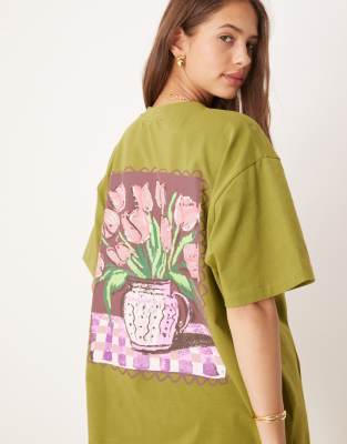 Camiseta verde oliva extragrande con estampado gráfico de jarrón con flores de ASOS DESIGN