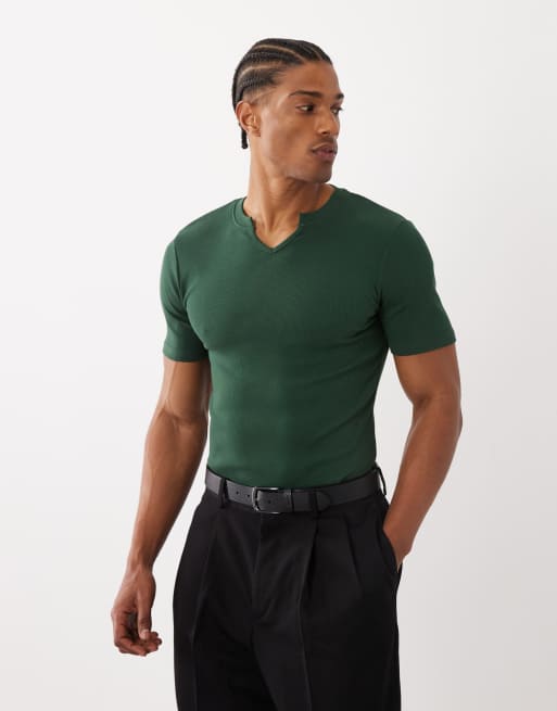 Camiseta verde oscuro ajustada con cuello de muesca de canalé de ASOS DESIGN.