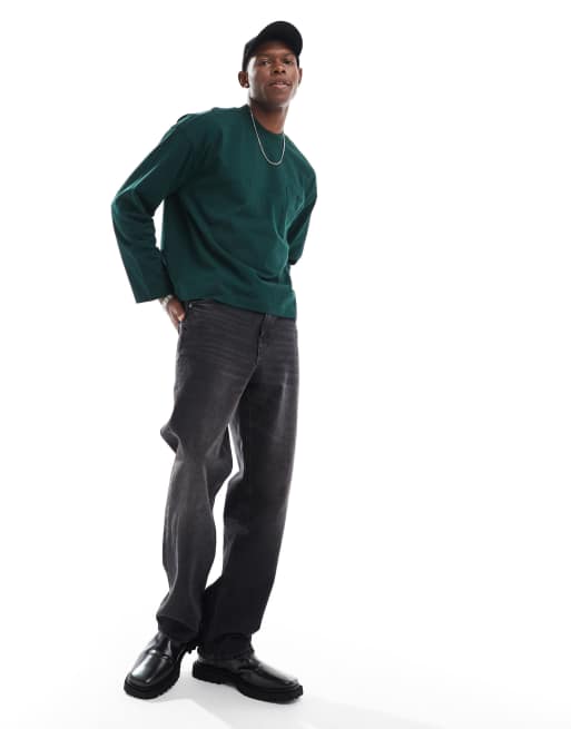 Camiseta verde oscuro de corte cuadrado extragrande y manga larga con bolsillo delantero de tejido grueso de ASOS DESIGN