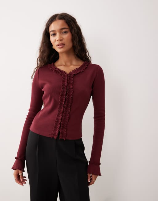 Cárdigan burdeos con detalle de volante de punto acanalado de algodón de ASOS DESIGN