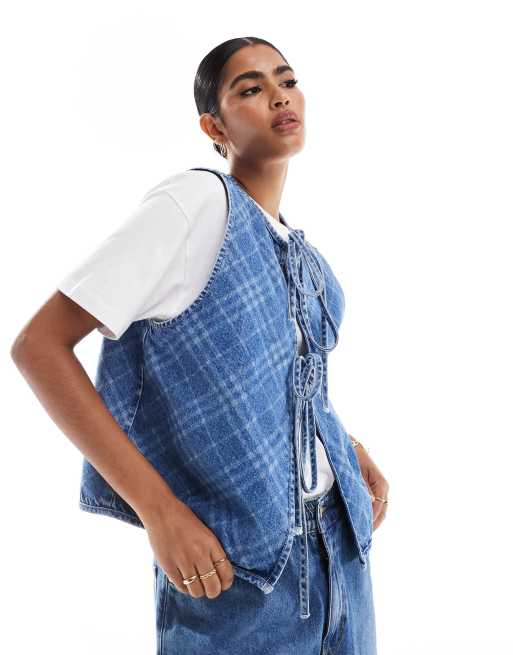 Chaleco vaquero a cuadros con lazadas delanteras de ASOS DESIGN
