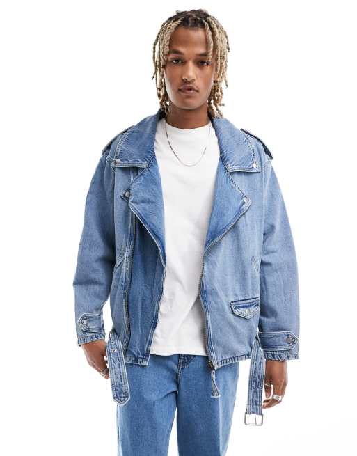 Chaqueta biker azul extragrande con lavado medio de ASOS DESIGN