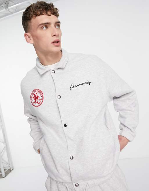 Chaqueta blanco jaspeado de estilo entrenador con logos estampados en el pecho de punto de ASOS DESIGN