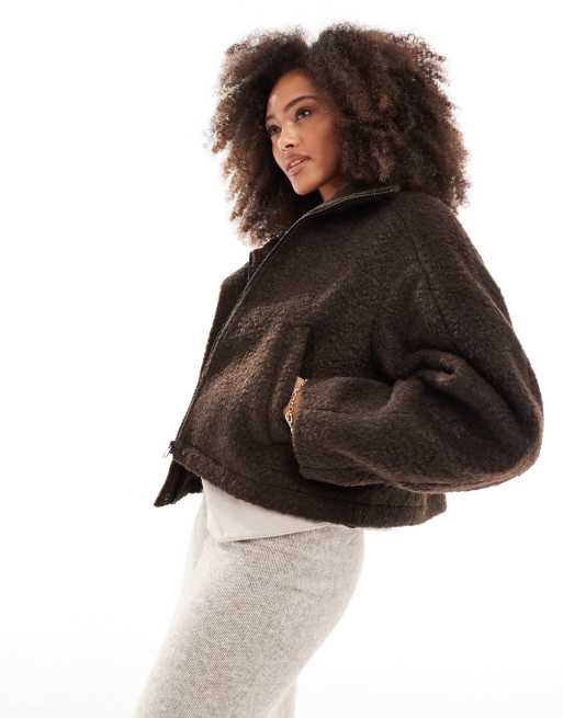 Chaqueta bomber marrón chocolate con cuello alzado de bouclé de ASOS DESIGN