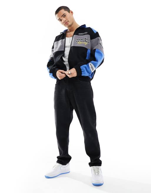 Chaqueta bomber negro lavado extragrande con diseño de motocross de ASOS DESIGN