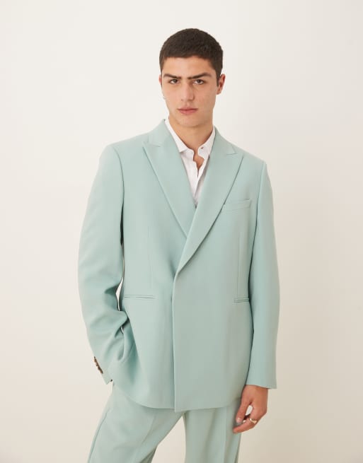 Chaqueta de traje azul de corte estándar con doble botonadura de sarga de tejido efecto lino de ASOS DESIGN