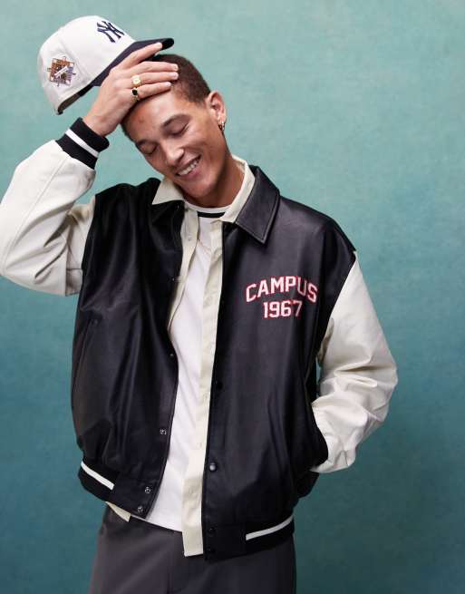 Chaqueta universitaria negra extragrande con mangas de cuero sintético de ASOS DESIGN