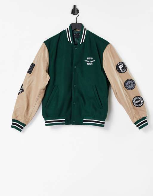 Chaqueta universitaria verde con parches de cuero auténtico de ASOS DESIGN