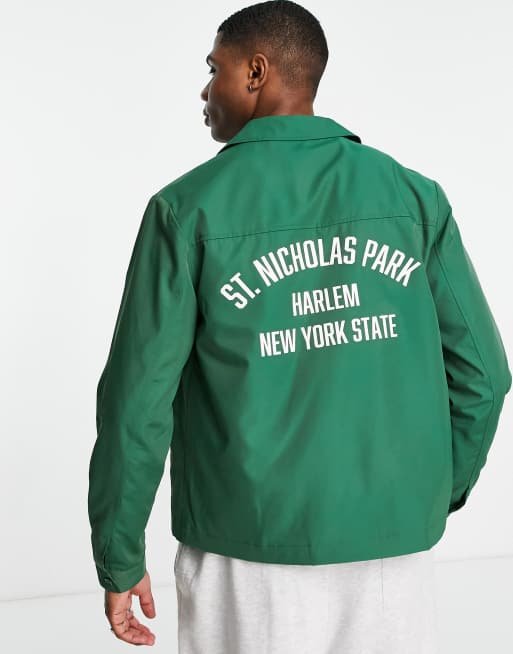 Chaqueta verde estilo entrenador con diseño universitario y estampado en la espalda de nailon ligero de ASOS DESIGN