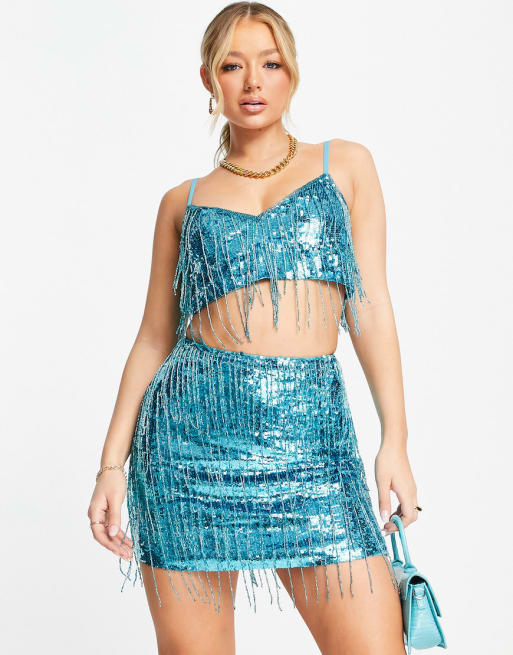Conjunto azul para festivales con flecos y abalorios de ASOS DESIGN