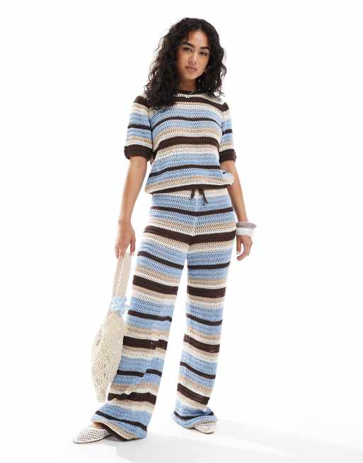 Conjunto azul y marrón a rayas de camiseta y pantalones de pernera ancha de punto de croché de ASOS DESIGN