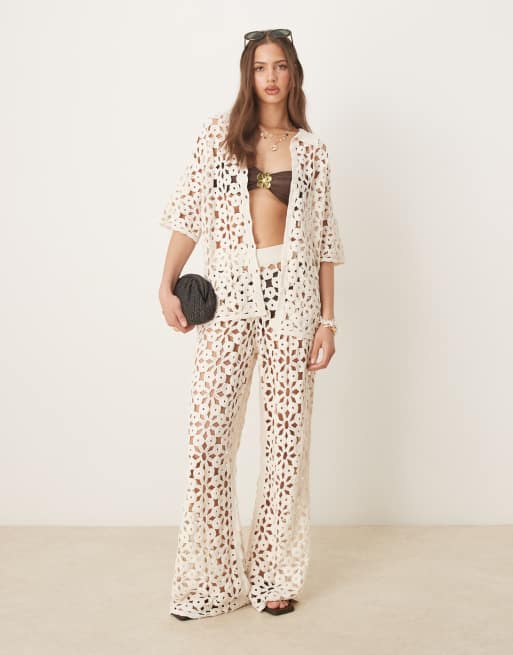Conjunto color crema de pantalones de pernera ancha y camisa de punto de croché de ASOS DESIGN