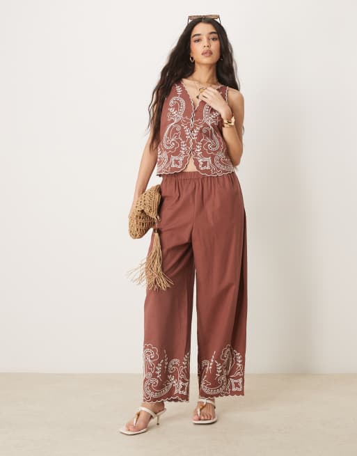 Conjunto marrón de pantalones y chaleco con diseño bordado y bordes festoneados de mezcla de lino de ASOS DESIGN