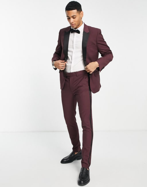 Esmoquin burdeos de corte entallado con solapas negras de ASOS DESIGN