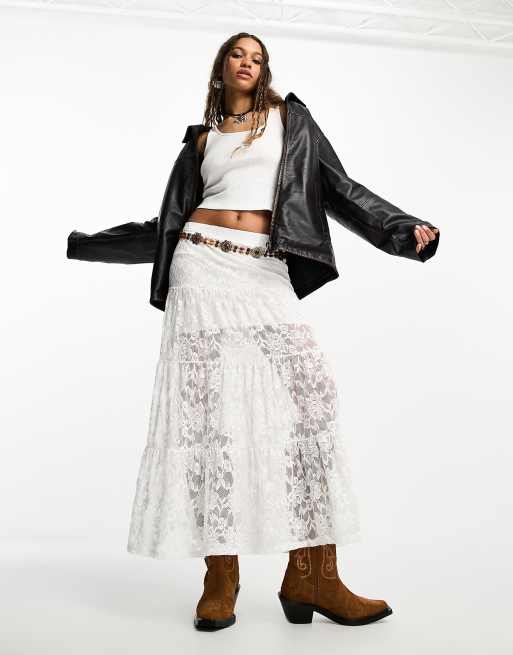 Falda larga color crema escalonada de estilo campero de encaje de ASOS DESIGN