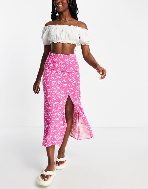 Falda lencera midi rosa con estampado de florecitas y abertura en el muslo de ASOS DESIGN