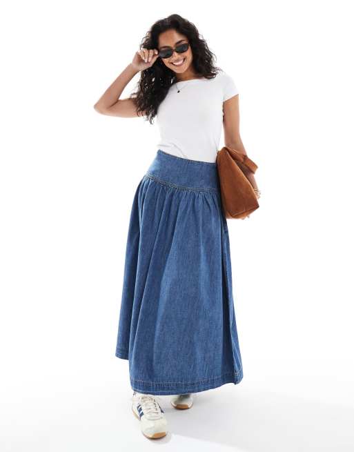 Falda vaquera larga con lavado azul medio y cintura baja de tejido con lino de ASOS DESIGN