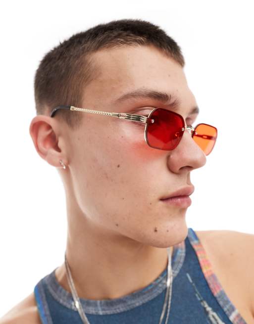 Gafas de sol doradas con montura rectangular en ángulo y lentes rojas de ASOS DESIGN