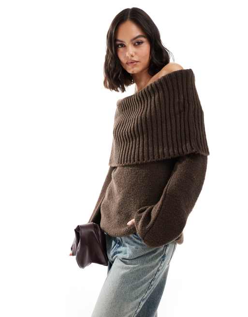 Jersey color chocolate con escote Bardot de canalé grueso de ASOS DESIGN