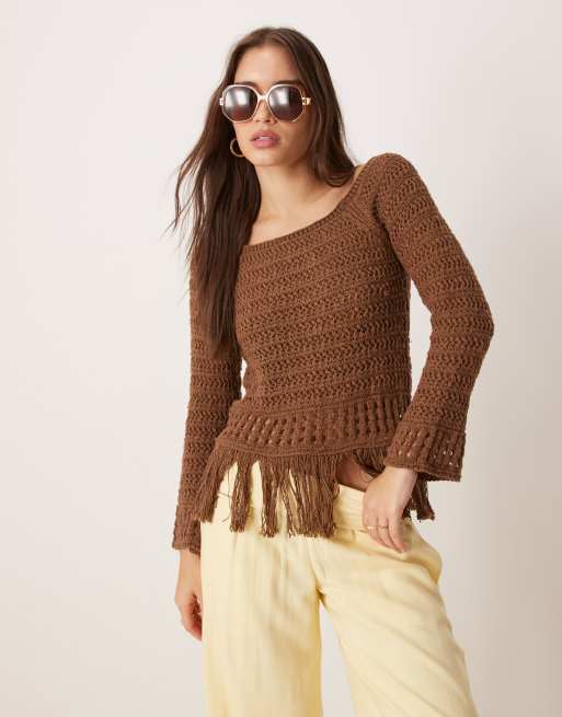 Jersey marrón chocolate con hombro caído y bajo de flecos de croché de ASOS DESIGN