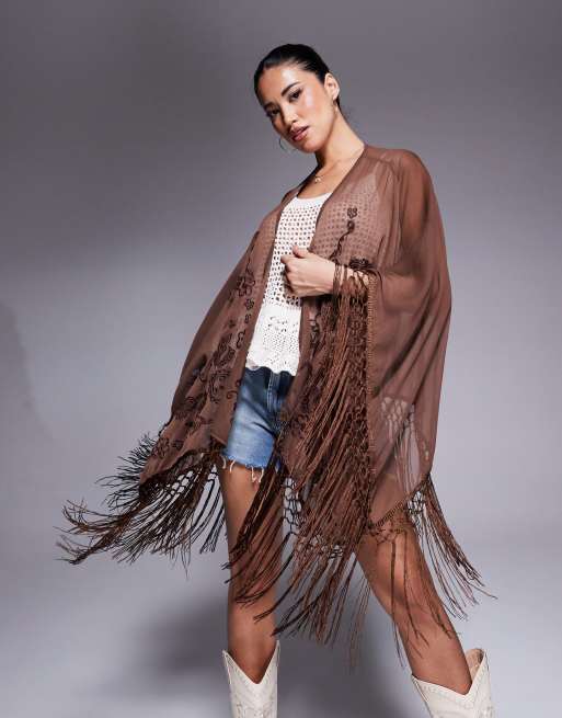 Kimono marrón con bordados y detalle de flecos de ASOS DESIGN