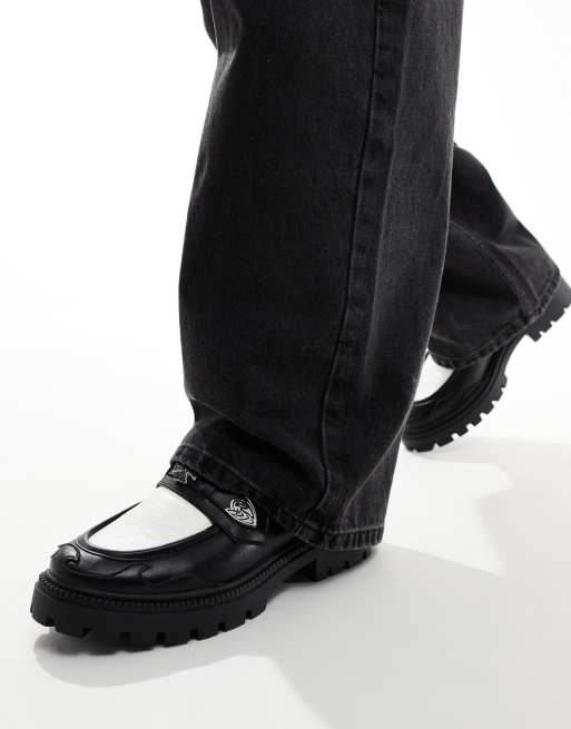 Mocasines negros y blancos con suela gruesa y detalles de estilo wéstern de cuero sintético de ASOS DESIGN