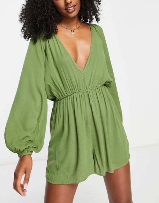 Mono corto playero caqui escotado de tejido rugoso vaporoso de ASOS DESIGN