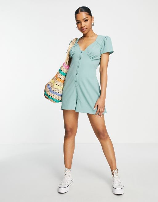 Mono de tarde corto verde salvia abotonado en la parte delantera con manga de casquillo de crepé de ASOS DESIGN