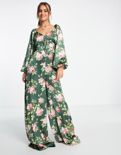 Mono de tarde largo negro con estampado floral y cordones en la espalda de satén de ASOS DESIGN