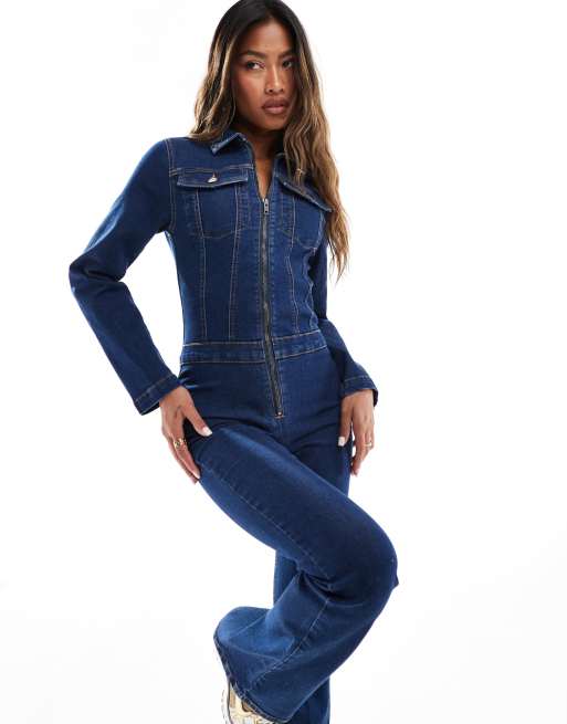Mono largo azul oscuro elástico de manga larga de estilo años 70 de ASOS DESIGN
