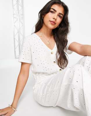 Mono largo blanco con botones delanteros, lazo a la cintura y detalles bordados de ASOS DESIGN