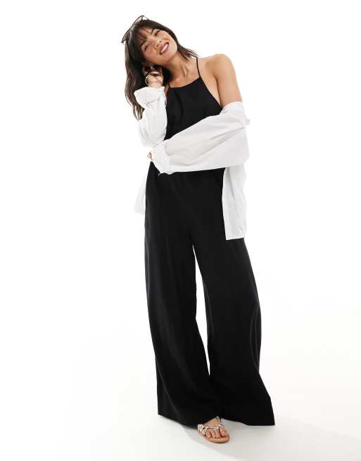 Mono largo negro con cuello de nadadora y patrón de hilos cruzados de lino de ASOS DESIGN