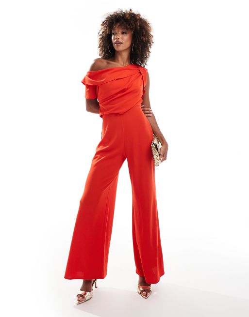 Mono largo rojo de pernera ancha con hombro caído y detalle recogido de ASOS DESIGN