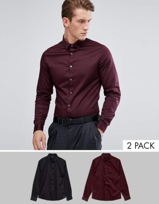 Multi-pack de camisas de corte slim en satén negro y burdeos de ASOS DESIGN