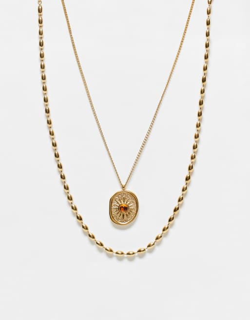 Pack de 2 collares dorados de cadena de esferas de acero inoxidable resistente al agua con colgante ovalado de sol de ASOS DESIGN